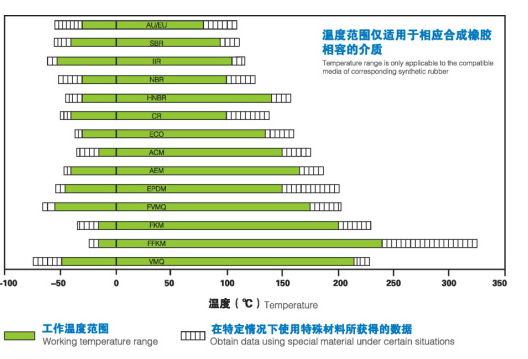 现有的各种合成橡胶材质可满足O型圈在不同情况下的工作温度。根据产品工况,可以选取适合其温度的O型圈橡胶材质。